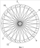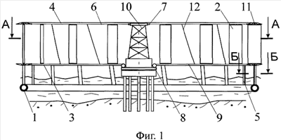 На чертежах обозначено: 1 – кольцевой понтон-ротор, 2 – поворотные лопасти, 3 и 4 – нижний и верхний (соответственно) кольцевые диски, 5 – полые профильные колонны для крепления нижнего диска 3 с кольцевым понтоном-ротором 1, 6 – горизонтальные радиальные гибкие тяги для крепления верхнего кольцевого диска 4 с опорным кольцом 7, 8 – ступица преобразователя энергии (не показан), 9 – горизонтальные гибкие тяги для крепления ступицы 8 с нижним кольцевым диском 3, 10 – неподвижная башня, 11 – вертикальные оси лопастей, 12 – наклонные штанги.