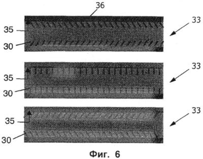 В примере на фиг.6 все полимерные исполнительные элементы 30, включая также те из них, которые находятся в разных рядах, движутся одновременно. Функционирование полимерных исполнительных элементов 30 можно улучшить путем адресации исполнительных элементов 30 по отдельности или адресации рядов исполнительных элементов 30 таким образом, что они станут двигаться не в фазе. Например, в электрически стимулируемых исполнительных элементах 30 это можно осуществить путем использования электродов в виде рисунков, которые могут быть встроены в стенки 36 микроканала 33 (не показано). Таким образом, движение исполнительных элементов 30 проявляется в виде прохождения волны по внутренней стороне 35 стенки 36 микроканала 33, что аналогично движению волны, проиллюстрированному на фиг.3. Средства обеспечения движения могут генерировать движение волны, которая может проходить в том же направлении, что и рабочее маховое движение («симплектический метахронизм») или в противоположном направлении («антиплектический метахронизм»).