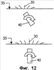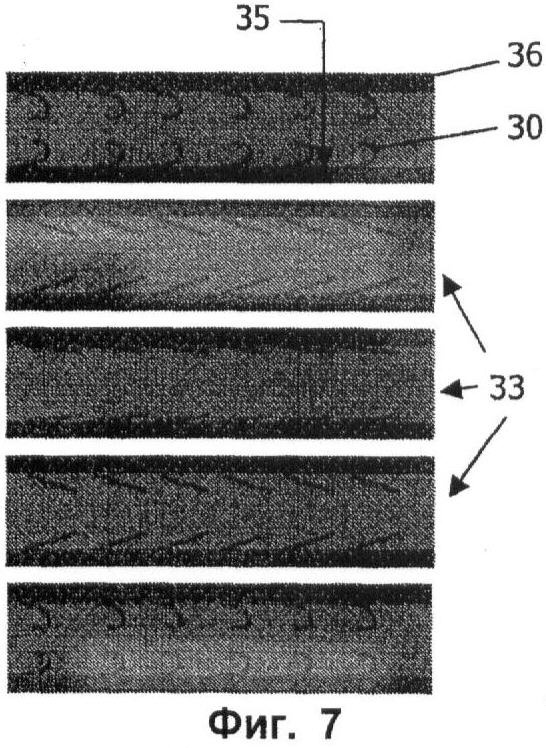 Другой вариант микрофлюидального канала 33, снабженного исполнительными элементами в соответствии с настоящим изобретением, схематически изображен на фиг.7. Внутренняя сторона 35 стенок 36 микроканалов 33 в этом варианте осуществления может быть покрыта полимерными исполнительными элементами 30, которые могут изменять свою форму, переходя от завитой формы к прямой форме. Это изменение формы можно получить разными путями. Например, изменение формы исполнительного элемента 30 можно получить, управляя микроструктурой исполнительного элемента 30, например, путем внесения градиента эффективной жесткости материала по толщине исполнительного элемента 30, при этом верхний (или нижний) из исполнительных элементов оказывается жестче, чем нижний (или верхний). Это будет вызывать «асимметричный изгиб», т.е. исполнительный элемент 30 будет гнуться в одном направлении легче, чем в другом. Изменение формы исполнительного элемента 30 также может быть достигнуто путем управления возбуждением стимулирующего воздействия, такого, как зависимое от времени и/или пространства магнитное поле в случае магнитного принципа действия исполнительных элементов (фиг.13). Для ясности чертежей показана только часть полимерной МЭМС 31 исполнительных элементов 30. В этом варианте осуществления может быть получено ассиметричное движение исполнительных элементов 30, которое может быть дополнительно улучшено путем быстрого движения в одном направлении и медленного в другом, например, это может быть быстрое движение с переходом от завитой формы к прямой, или наоборот. Полимерные исполнительные элементы 30, выполненные с возможностью изменения формы, могут содержать полимерную МЭМС 31, например, стержнеобразной формы или балкообразной формы. В соответствии с вариантами осуществления изобретения, исполнительные элементы 30 могут быть расположены в одном или нескольких рядах, например, в первом ряду на внутренней стороне 35 стенки 36 и во втором ряду на внутренней стороне 35 стенки 36, при этом первый и второй ряды располагаются, по существу, в противоположных положениях на внутренней стороне 35 стенки 36. В других вариантах осуществления изобретения исполнительные элементы 30 могут быть расположены во множестве рядов исполнительных элементов 30, которые могут быть расположены так, что будут образовывать, например, двумерный массив. В еще одном варианте осуществления исполнительные элементы 30 могут быть расположены в произвольном порядке на внутренней стороне 35 стенки 36 микроканала 33. Либо исполнительные элементы 30 могут быть расположены в произвольном порядке на внутренней стороне 35 стенки 36 микроканала 33. За счет адресации исполнительных элементов 30 по отдельности или адресации ряда исполнительных элементов 30 можно генерировать волнообразное движение, движение, коррелированное иным образом, или некоррелированное движение, что может оказаться выгодным при транспортировке или смешивании текучих сред или создании вихрей, причем все это будет происходить внутри микроканала 33.