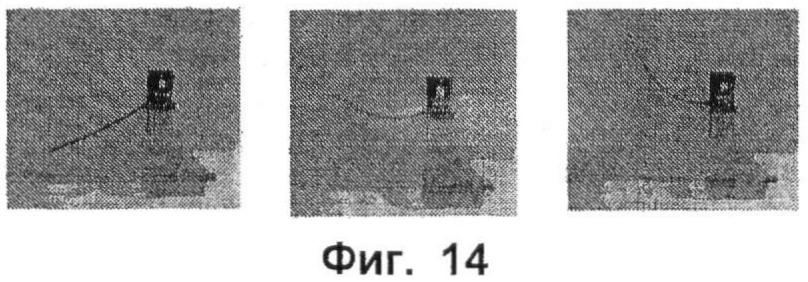фиг.14 – иллюстрацию работы исполнительного элемента из композита «иономерный полимер-металл» (КИПМ), который может включать в себя полимеры, например перфторкарбонатный или перфторсульфонатный исполнительный элемент, согласно дополнительному варианту осуществления настоящего изобретения.