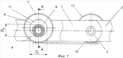 Тяговая цепь (фиг.1) содержит звенья, которые состоят из чередующихся пар внешних и внутренних пластин 1 и 2 соответственно. Каждая пара внешних пластин 1 связана друг с другом при помощи втулок 3, которые закреплены на концах внешних пластин 1. Каждая пара внутренних пластин 2 соединена между собой роликами 4, которые закреплены на краях пар внутренних пластин 2. Ролики 4 имеют осевое цилиндрическое отверстие 5 (фиг.2) и наружную цилиндрическую поверхность 6 (фиг.1) с диаметром Dp. Втулки 3 помещены внутрь цилиндрического отверстия 5 роликов 4 с возможностью их вращения относительно последних. На наружной цилиндрической поверхности 6 ролика 4 установлен каток 7, который имеет центральное цилиндрическое отверстие 8 (фиг.2) диаметром Dк с внутренней поверхностью 9. Каток 7 имеет ширину b. Втулки 3, ролики 4 и катки 7 изготавливают, как правило, из прочного и износостойкого материала, подвергаемого термической обработке для увеличения твердости.