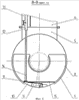 – полого поворотного днища 8, представляющего собой конструкцию, состоящую из цилиндрической обечайки с продольным вырезом и приваренных к ней по торцам, например, эллиптических днищ с арочными вырезами и опорно-поворотными наростами. На поворотном днище 8 установлено основание 9 люка донного клапана, с которым шарнирно соединена крышка 10 люка с опорным элементом 11, имеющим сферическую выемку. В закрытом положении крышка люка удерживается механическим и ручным приводами. Гидро- или пневмоцилиндр 12 механического привода закреплен на нижней царге 6 в отдельном отсеке 13 шахты и имеет шток 14 со сферическим концом. Также на днище установлен разборный настил 15;