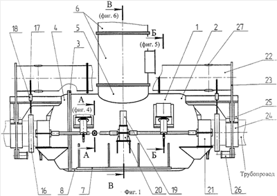 – устройства поворота поворотного днища 8, включающего в себя приводной двигатель любого принципа действия (гидромотор, электродвигатель и т.п.) 19, редуктор 20 и две двухступенчатые открытые цевочные передачи 21, расположенные вне корпуса 1 аппарата с двух его сторон, и прикрытые защитными кожухами. В кожухах расположены подшипниковые опоры валов цевочных передач. Ведомое колесо второй ступени цевочной передачи выполнено в виде зубчатого сектора для возможности монтажа аппарата на трубопровод, валом для этого колеса служит опорно-поворотный нарост поворотного днища 8;