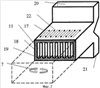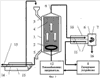 Один из вариантов конструкции теплообменника-рекуператора, представленного на фиг.2, реализован следующим образом. Теплообменник-рекуператор 10 выполнен в виде протяженного короба 17, стенки которого имеют теплоизолирующий слой 18. Полости 11 внутреннего объема для встречных, обменивающихся теплом потоков 22 образованы профилированной перегородкой 19. Такое техническое решение позволяет простыми средствами получить: большую поверхность теплообмена и необходимую протяженность рекуператора. Профилированная перегородка может быть выполнена наборной – из отдельных фрагментов профиля. Сформированные каналы 11 при этом легко могут быть герметизированы прижимом теплоизоляционного материала 18. Все каналы рекуператора открыты в объем конденсатора 7. На входном коллекторе 20 теплообменника 10 каналы одного направления 22 открыты, противоположного – закрыты. На выходном коллекторе 21, наоборот, каналы дополняющего направления открыты, противоположного – закрыты.