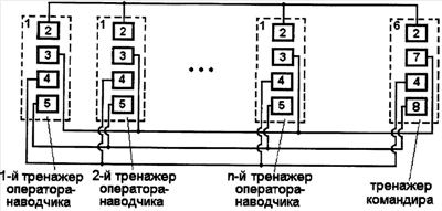 1. Система обучения поиску и уничтожению цели группы операторов-наводчиков установок пуска ракет, характеризующаяся тем, что она содержит тренажеры подготовки операторов-наводчиков и тренажер командира, включенные в единую сеть, при этом тренажер оператора-наводчика содержит блок акустической связи, блок управления имитатором визуальной обстановки, блок выдачи и приема признака поражения цели и блок контроля, а тренажер командира содержит блок акустической связи, блок управления включением имитаторов визуальной обстановки тренажеров подготовки операторов-наводчиков, блок выдачи и приема признака поражения цели и блок контроля за действиями операторов-наводчиков, при этом все выходы блоков выдачи и приема признака поражения цели всех тренажеров соединены между собой для передачи в блоки выдачи и приема признака поражения цели в тренажеры подготовки операторов-наводчиков и в блок выдачи и приема признака поражения цели тренажера командира признака пораженной цели для отображения в соответствующих имитаторах визуальной обстановки каждого из тренажеров вида пораженной цели, а блок акустической связи тренажера командира имеет двустороннюю связь с блоком акустической связи каждого из тренажеров подготовки оператора-наводчика, при этом выход блока управления имитаторами визуальной обстановки тренажера командира соединен с входами блоков управления имитаторов визуальной обстановки тренажеров подготовки операторов-наводчиков.
