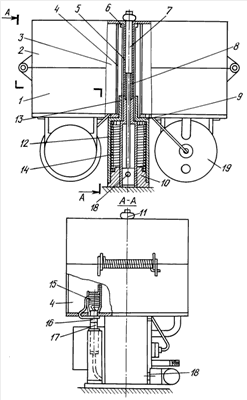 На чертеже изображен общий вид устройства, где обозначено: 1 – кассета, 2 – самораскрывающиеся створки, 3 – тонкопленочные оболочки в сложенном состоянии, 4 – две перегородки между оболочками, 5 – трубчатая направляющая со шлицами на наружной поверхности, 6 – гайка, 7 – шток, 8 – пружинка, выталкивающая шток, 9 – конические гнезда на верхнем торце подвижного стакана (12) под конические штифты на днище кассеты, исключающие относительное поперечное смещение стакана и кассеты, 10 – основание пускового устройства, 11 – гайка, удерживающая створки (2) в закрытом положении, 12 – подвижный стакан механизма выталкивания, 13 – направляющая втулка стакана (12) со шлицами на внутренней поверхности, 14 – пружина выталкивания кассеты, 15 – свободная петля электрокабеля, 16 – электровилка, 17 – электророзетка, 18 – пирочека, 19 – газогенератор для наддува тонкопленочной оболочки после отделения кассеты от носителя.