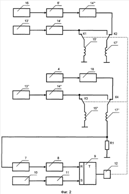 Выходы индукционного датчика 16 подсоединены к синусной и косинусной обмоткам статора первого СКВТ 6′, обмотка ротора которого подключена к входу третьего усилителя 14″‘. Выход третьего усилителя 14′” подключен к размыкающему контакту первого переключающего контакта К2 электромагнитного реле 12, к подвижному контакту переключающего контакта К2 подсоединена обмотка 17’ ротора первого датчика момента ДНГ 3. Выход ЖМД 4 подключен к входу преобразователя 18 сигнала ЖМД 4, выход которого подсоединен к размыкающему контакту второго переключающего контакта К4 электромагнитного реле 12.