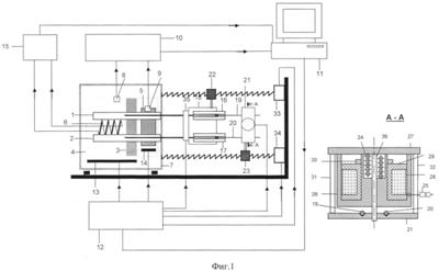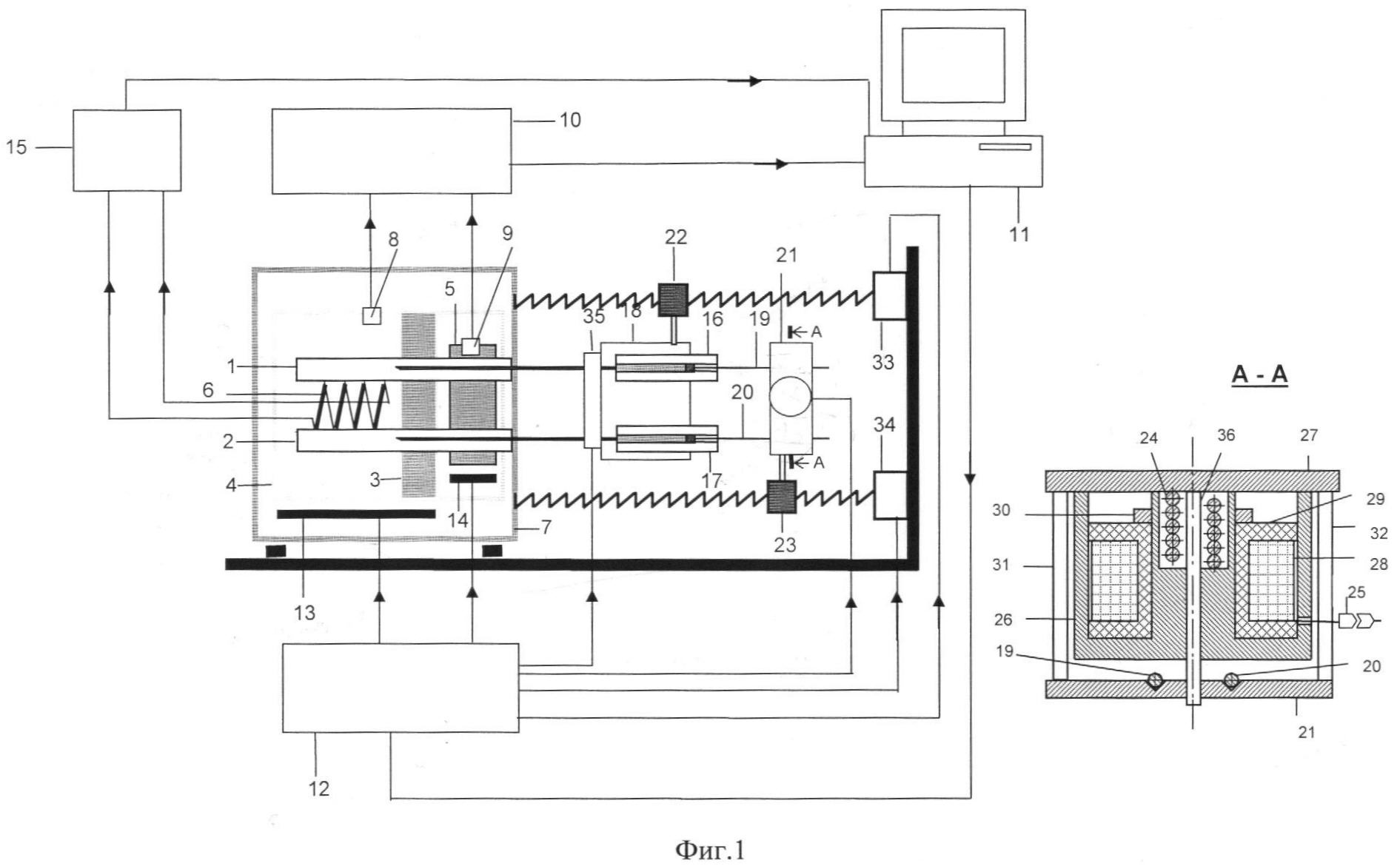 Для введения реагентов в калориметрические камеры калориметр снабжен дозирующим шприцем с иглой 16 для эталонной камеры и дозирующим шприцем с иглой 17 для рабочей камеры, размещенных в держателе 18. Поршни через штоки дозирующих шприцев 19 и 20 объединены связывающей их пластиной 21. Для обеспечения введения реагентов в калориметрические камеры держатель шприцев связан с винтовым механизмом 22, а пластина связана с винтовым механизмом 23. При этом пластина 21 снабжена управляемым от компьютера узлом механической связи штоков поршней 19 и 20 дозирующих шприцев с пластиной. Указанная механическая связь обеспечивается пружиной 24. Разрыв этой механической связи обеспечивается управляемым от компьютера 11 через разъем 25 электромагнитом, состоящим из магнитопроводов 26 и 27, электрической катушки 28, намотанной на каркасе 29. Катушка закреплена на магнитопроводе гайкой 30, что обеспечивает перемещение магнитопровода 26 вдоль оси 36; при наличии управляющего сигнала обеспечивается примагничивание магнитопроводов 26 и 27 и отключение механической связи штоков поршней с пластиной, а при отсутствии управляющего сигнала обеспечивается прижатие штоков поршней 19 и 20 к пластине 21 магнитопроводом 26. Магнитопровод 27 жестко закреплен стойками 31 и 32 на пластине 21. Стойки 31 и 32, пластина 21 и ось 36 выполнены из нержавеющей стали. Винтовой механизм 22 приводится в движение шаговым двигателем 33, а винтовой механизм 23 – шаговым двигателем 34. Управление шаговыми двигателями осуществляется компьютером через блок усилителей мощности 12. Колебательный режим дозирующих игл обеспечивается вибрационным устройством 35, частота колебаний которого управляется компьютером через блок усилителей мощности 12.