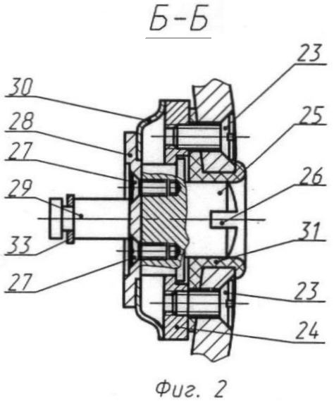 Балансировочное устройство представляет собой грузики 20, перемещающиеся на резьбовой шпильке 21, которая одним концом жестко закреплена на хвостовике 17 зубчатого сектора 15, причем шпилька 21 расположена вертикально вниз и ее ось расположена на определенном расстоянии х от оси 16 вращения зубчатого сектора 15. В новой конструкции прибора корректор нуля вынесен на корпус 1 и представляет собой цилиндрическую пружину растяжения 22 с устройством ее натяжения (на фиг.2 – разрез Б-Б на фиг.1), которое крепится к корпусу при помощи винтов 23 и крепежной шайбы 24 и состоит из винта 25 с прорезью 26 с лицевой стороны, а к тыльной торцевой крепится винтами 27 диск 28 с эксцентриком 29, которые выполнены заодно, причем для удержания корректора нуля в фиксированном положении между крепежной шайбой 24 и диском 28 с эксцентриком 29 расположена тарельчатая пружина 30, надежный натяг с запасом которой создается при креплении винтами 27 диска 28 с эксцентриком 29 в резьбовые отверстия тыльного торца винта 25 с прорезью 26, причем винт 25 расположен во втулке 31, имеющей отбортовки и выполненной, например, из резины, что дает возможность вставить втулку 31 в имеющееся посадочное отверстие в корпусе 1 прибора и закрепить в нем при помощи отбортовок. Цилиндрическая пружина растяжения 22 крепится при помощи прицепов 32, полученных посредством отгиба крайних витков пружины 22, причем один прицеп свободно вставляется в отверстие серьги 33 винта 25 с эксцентриком 29, а другой – в отверстие ушка 34, которое жестко закреплено на трубчатой пружине Бурдона 5 к наконечнику 6.