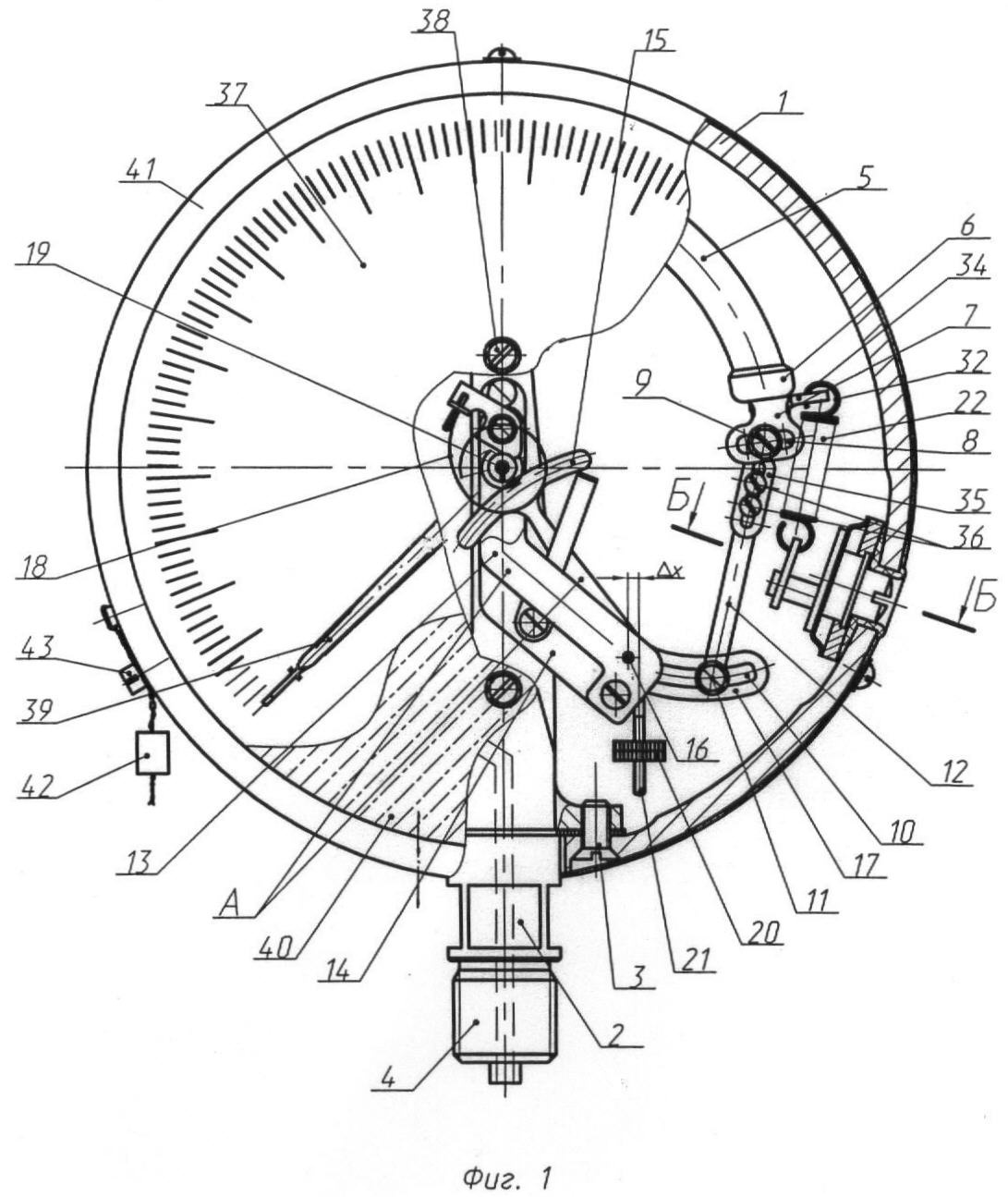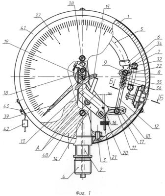 Круглый циферблат 37 имеет меньший диаметр, чем внутренний диаметр корпуса 1, и три сквозных отверстия, первое из которых расположено в центре циферблата 37 и предназначено для прохода оси трибки 19, а второе и третье расположены в плоскости, проходящей через оси трибки 19 и штуцера 4 и предназначены для прохода через них винтов 38, соединяющих циферблат 37 с держателем-основанием 2. Указательная стрелка 39 насажена на конечную часть оси трибки 19. Защитное стекло 40 крепится к корпусу 1 прибора с лицевой стороны при помощи обечайки 41, которая закреплена на корпусе 1 тремя винтами, расположенными друг к другу под углом 120 градусов, на одном из которых устанавливается пломба 42 с контрольным винтом 43.
