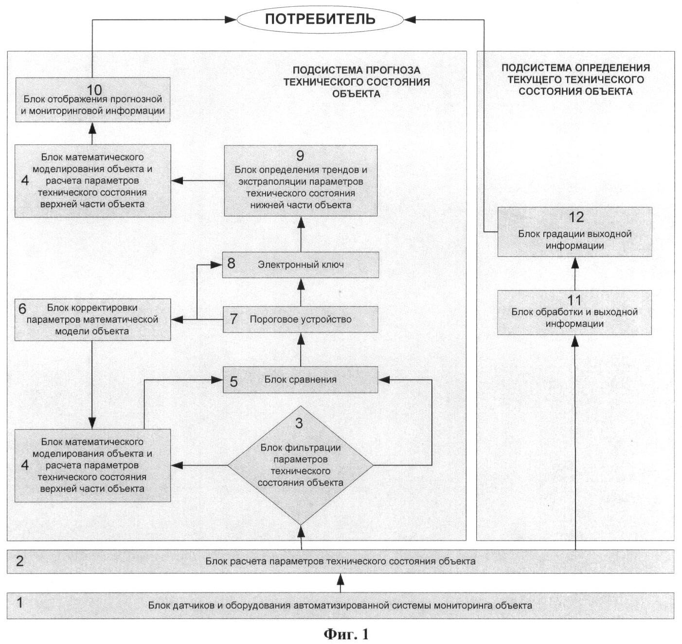 Указанный технический результат в изобретении – системе мониторинга и прогноза технического состояния объекта достигается тем, что в системе, содержащей устройство ударного устройства, блок обработки и выходной информации, блок градации выходной информации, и/или вибродатчики, и/или датчики измерения ускорений колебаний объекта, и/или датчики измерения скоростей колебаний объекта и/или датчики измерения амплитуд колебаний объекта, и/или датчики измерения наклонов, и/или датчики измерения прогибов, и/или датчики измерения напряжений, и/или датчики измерения нагрузок, и/или датчики измерения абсолютной и неравномерной осадки, и/или датчики контроля трещин, стыков и швов, и/или датчики измерения геодезических параметров дополнительно включены датчики давления (давление объекта на грунт и/или давление грунта на объект), и/или датчики измерения деформаций, и/или датчики измерения температуры, и/или датчики измерения влажности, (при этом все перечисленные выше датчики объединены в одном блоке – блок датчиков и оборудования автоматизированной системы мониторинга), блок расчета параметров технического состояния объекта, блок фильтрации параметров технического состояния объекта, блок сравнения, пороговое устройство, блок математического моделирования и расчета параметров технического состояния верхней части объекта, блок корректировки параметров математической модели объекта, электронный ключ, блок определения трендов и экстраполяции параметров технического состояния нижней части объекта, блок отображения прогнозной и мониторинговой информации, причем выход блока датчиков и оборудования автоматизированной системы мониторинга соединен с входом блока расчета параметров технического состояния объекта, первый выход которого соединен с входом блока фильтрации параметров технического состояния объекта, а второй выход соединен с входом блока обработки и выходной информации, выход которого соединен с входом блока градации выходной информации, первый выход блока фильтрации параметров технического состояния объекта соединен с первым входом блока математического моделирования и расчета параметров технического состояния верхней части объекта, второй выход блока фильтрации параметров технического состояния объекта соединен с входом блока сравнения, выход блока сравнения соединен с входом порогового устройства, первый выход которого соединен с входом блока корректировки параметров математической модели объекта и первым управляющим входом электронного ключа, а второй выход соединен со вторым управляющим входом электронного ключа, выход блока корректировки параметров математической модели объекта соединен со вторым входом блока математического моделирования объекта и расчета параметров технического состояния верхней части объекта, первый выход которого соединен с входом блока сравнения, а второй выход соединен с первым входом блока отображения прогнозной и мониторинговой информации, третий вход блока математического моделирования объекта и расчета параметров технического состояния верхней части объекта соединен с выходом блока определения трендов и экстраполяции параметров технического состояния нижней части объекта, вход которого соединен с выходом электронного ключа.