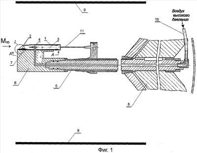 Приемник давления 11 на выходе проточного канала 3 (на срезе сопла) служит вспомогательным целям: определению степени нерасчетности истечения струи, равномерности поля газодинамических параметров. Эти данные важны при исследовании интерференционного влияния струи.