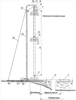 После проверки устройства модель судна позиционируют (устанавливают) в конце мерного участка акватории водоема на расстоянии L=kH (м) от начала мерного участка, где k – количество шкивов в полиспасте; Н (м) – расстояние, измеренное по вертикали от оси подвижного блока 6 в его верхнем положении до оси этого блока в его нижнем положении (от верхнего до нижнего положений подвижного блок полиспаста).
