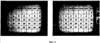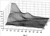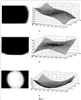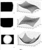 Параметров в этом преобразовании 9, но только 8 из них независимые, все параметры могут быть умножены на одно и то же число. Таким образом, найдя соответствие между четверками точек, мы знаем закон преобразования координат между плоскостью объекта и плоскостью изображения, т.е. преобразование P(R(r)). Теперь о выборе точек для определения параметров преобразования. Дело в том, что в плоскости изображения распределение соответствует не просто проективно преобразованному объекту, на проективное преобразование накладывается еще и дисторсионное искажение. Если в качестве реперных точек использовать угловые точки изображения, то при сравнении изображения и исходного калибровочного объекта, деформированного путем вышеуказанных преобразований для соответствия ракурсу съемки, мы получаем картину, изображенную на Фиг.4. Слева показана матрица горизонтальной составляющей смещения пикселей изображения за счет дисторсии, справа – вертикальная составляющая. Серый тон соответствует нулевому смещению, светлый – смещению налево (для горизонтальной компоненты) или вверх (для вертикальной компоненты), темный – смещению направо (вниз). На Фиг.5 показано распределение абсолютных значений смещений в зависимости от координат в кадре. Чем темнее тон, тем больше искажения. Неискаженными остаются угловые области, где мы выбрали реперные точки, и центр. Смещение центра неискаженной области относительно центра кадра соответствует смещению точки пересечения оптической оси камеры с приемной матрицей относительно центра матрицы. В первом приближении (когда оптическая ось камеры пересекает плоскость приемной матрицы строго в центре) картина сдвигов симметрична. Таким образом, выбор точек с априорно одинаковым значением дисторсии в качестве реперных приводит к нахождению истинных значений параметров проективного преобразования за исключением масштаба. Тем не менее, применение этой характеристики позволяет правильно провести коррекцию кривизны изображений. Масштаб же восстанавливается с помощью естественного предположения о том, что искажения изображения минимальны в центре кадра. После введения поправки к масштабному преобразованию мы получаем искомое преобразование P(R(r)). Теперь при сравнении изображения и калибровочного объекта, к которому применено преобразование для соответствия ракурсу съемки, мы получаем картину распределения величины дисторсионного искажения, показанную на Фиг.6. Слева – матрица горизонтальной составляющей смещения, справа – вертикальная составляющая. Чем светлее тон, тем больше смещение налево (вверх), чем темнее, тем больше смещение направо (вниз). На Фиг.7 показано распределение абсолютных значений смещения в зависимости от координат в кадре. Чем темнее тон, тем искажения больше. Видно, что в центральной части кадра искажения минимальны, сильнее всего дисторсия сказывается в угловых областях. Для обычных цифровых фотоаппаратов среднего класса максимальная величина смещения положения точек изображения относительно идеального составляет десятки пикселей, до трех-пяти процентов от линейного размера изображения.