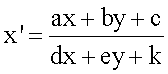 В общем случае виртуальная плоскость объекта и плоскость изображения связаны друг с другом преобразованиями поворота, сдвига, масштаба и проекции (т.е. степенью трапециевидности изображения прямоугольного объекта). Преобразование определяется восемью параметрами, из которых 2 отвечают за сдвиг, 1 – за поворот, 1 – за масштаб. Воспользуемся основной теоремой о проективном преобразовании плоскости (каковы бы ни были четыре точки А, В, С, D плоскости П, из которых никакие три не лежат на одной прямой, и четыре точки А’, В’, С’, D’ той же плоскости, из которых никакие три также не лежат на одной прямой, существует и притом только одно проективное преобразование, которое точки А, В, С, D переводит соответственно в точки А’, В’, С’, D’). Таким образом, для полного определения параметров преобразования необходимо и достаточно найти попарное соответствие четырех точек в плоскости объекта и четырех точек в плоскости изображения, причем никакие три точки не должны лежать на одной прямой. Координаты х’, у’ точки в плоскости изображения связаны с координатами х, у в плоскости объекта дробно-линейными соотношениями: