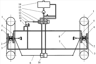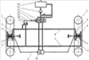 Датчики боковой реакции дороги 4 и 5, трубопроводы 7 и 8, гидромеханический включатель и распределительное устройство 13 потока рабочей жидкости образуют систему управления реверсивным механизмом изменения рабочей длины поперечной рулевой тяги 16.