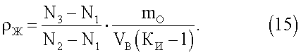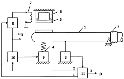 пружины KП, полностью исключаются. Кроме того, определение плотности жидкости по алгоритму (15) не требует предварительной градуировки прибора, так как числовое значение плотности измеряемой жидкости определяется заранее введенными в память вычислительно-управляющего блока 11 значениями mO, VB и KИ. Применение постоянного магнита 6 для удержания образцовой массы 5 в тех случаях, когда измерения не производятся, позволяет экономить расход электроэнергии. Питание в обмотку 7 магнита 6 подается только при формировании аддитивного теста. Во всех остальных случаях эта обмотка обесточена.