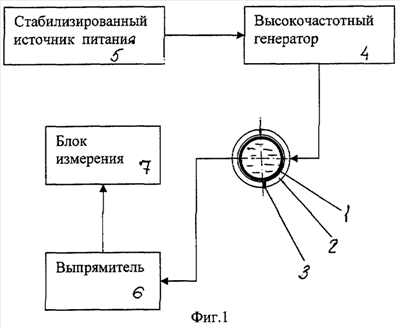Внутренний корпус 1 выполнен из диэлектрического материала. Это может быть, например, пробирка, которую заполняют исследуемым нефтепродуктом. Внешний корпус 2 может быть выполнен, например, в виде отрезка медной трубы, разделенной пополам вдоль по образующей. Половины соединены между собой через диэлектрик, например склеены эпоксидным клеем. К обеим половинам подключен выход высокочастотного генератора 4.
