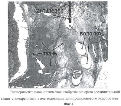 По АСМ-исследованиям поверхности среза волокон эндопротеза с включениями соединительной ткани все значения феноменологических параметров – в 3-5 раз больше (Ra=(142.1±31.2) нм; Rq=(171.5±36.0) нм; Ry=(799.7±107.2) нм); а силы адгезии при взаимодействии зонда с поверхностью – в 3-6 раз меньше (F=(9.2±4.0) нН), чем для поверхности среза волокон полипропиленового эндопротеза, имплантированного между апоневрозом и мышечными слоями спины крыс (из примера 1: Ra=(32.5±5.1) нм; Rq=(41.4±6.8) нм; Ry=(300.6±79.5) нм; F=(30.7±11.9) нН). Эти результаты хорошо коррелируют с данными, полученными при исследовании поверхности среза исходного полипропиленового волокна (контрольный образец 1): Ra=(92.2±10.1) нм, Rq=(117.8±26.1) нм, Ry=(649.0±68.7) нм, F=(5.6±2.1) нН.