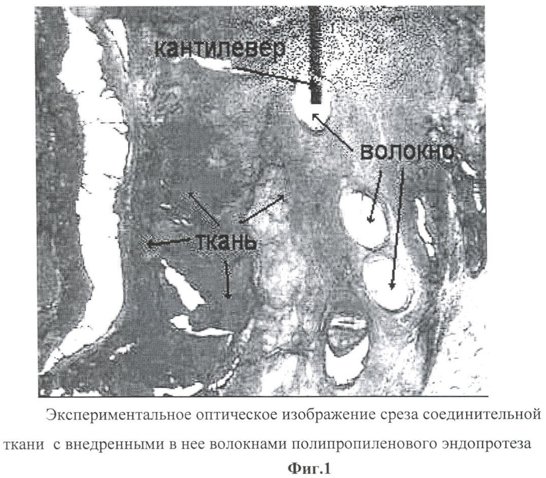 ZOOM-128. На фиг.1 приведено оптическое изображение поверхности среза соединительной ткани с внедренными в ее структуру волокнами сетчатого полипропиленового эндопротеза (вид сверху).