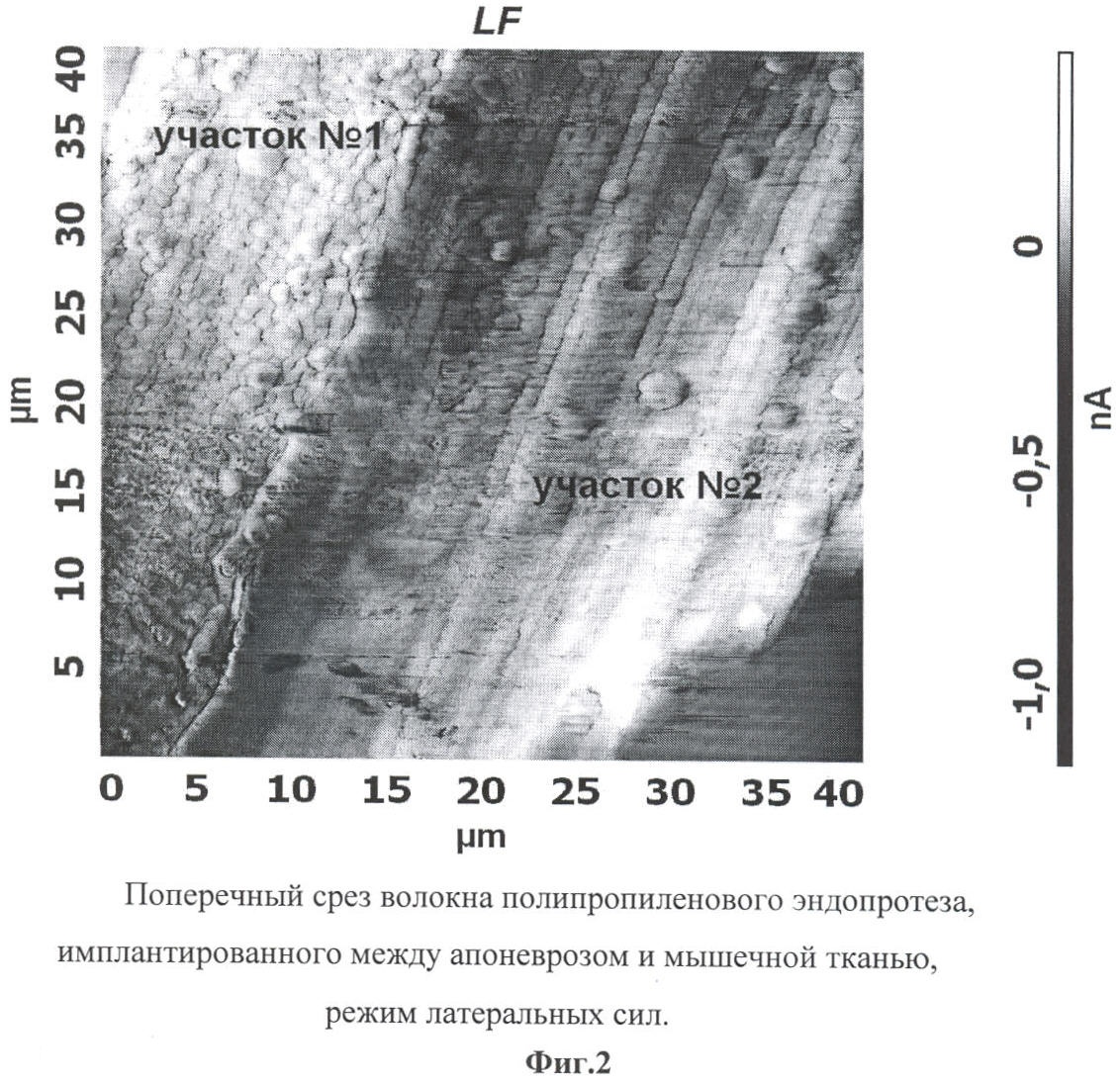 АСМ-изображения распределения латеральных сил на поверхности среза волокон сетчатого полипропиленового эндопротеза, имплантированного между апоневрозом и мышечными слоями (опытный образец), показали отчетливые различия в структуре исследуемой поверхности (фиг.2). Выявлены участки, структура которых аналогична структуре поверхности среза исходного полипропиленового волокна (участок 2) и структуре поверхности среза соединительной ткани (участок 1). АСМ-исследования провели на 9 участках для каждого из 3 срезов специально обработанных кусочков тканей с имплантированным сетчатым полипропиленовым эндопротезом (фиг.1).