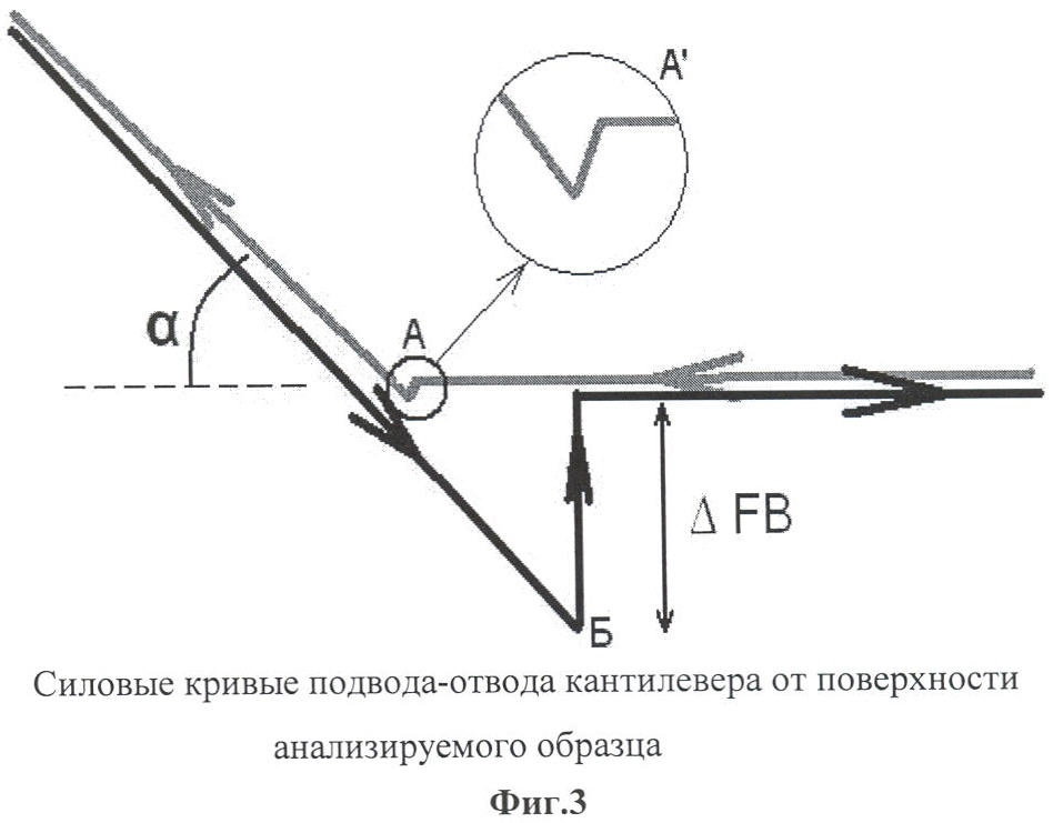 В режиме атомно-силовой спектроскопии регистрация силовых кривых подвода-отвода осуществлялась с помощью программного обеспечения управления АСМ. Из силовых кривых подвода-отвода (фиг.3) по формуле (4) вычислялась сила адгезии (F) между зондом и поверхностью образца: