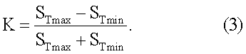 Затем заменяют эталонный объект 1 на исследуемый. В частности, стеклянную кювету заполняют исследуемой воздушной средой, которая может находиться как в стационарном состоянии, представляя собой объект 1 с постоянными оптическими свойствами, так и в движении, когда объект 1 характеризуется изменяющимися в течение времени свойствами, и проводят аналогичные измерения. Формируют для полученного изображения (фиг.4, 5) профиль оптического сигнала на высокой пространственной частоте с фиксацией наибольшего значения сигнала Sтmax (фиг.8) и профиль оптического сигнала на средней пространственной частоте с фиксацией наименьшего значения сигнала Sтmin (фиг.9). По полученным значениям сигналов определяют текущий контраст К: