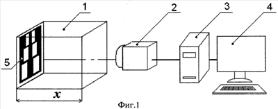 Световой поток от источника света (не показан), проходя через тест-объект 5 или отражаясь от него естественным дневным светом, освещает объект 1, в качестве которого может быть использована воздушная среда, находящаяся в стеклянной кювете, длина которой равна (х).