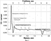 На Фиг.3 показан пример сигнала оптико-акустического преобразователя. По времени прихода рассеянных импульсов определяют глубину нахождения дефекта, а по измеренной толщине объекта и времени прихода сигнала, отраженного от его тыльной поверхности, – скорость ультразвука в объекте контроля.