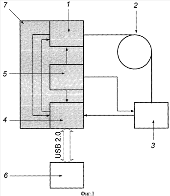 6 – систему обработки данных, включающую компьютер, связанный скоростной линией передачи данных с аналого-цифровым преобразователем и программным обеспечением, обеспечивающим прием цифровых данных, их спектральную обработку и отображение результатов на экране монитора, а также интерактивное управление процессом передачи и обработки данных;