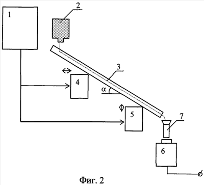 Как показали эксперименты, оптимальным материалом для изготовления желоба 3 является нержавеющая фольга толщиной (0,1÷0,2) мм, оптимальным углом его наклона к горизонту является угол (5÷15)°C, а оптимальный диапазон частот при этих условиях составляет (100÷1000) Гц, если длина желоба не превышает (10÷15) см.