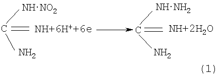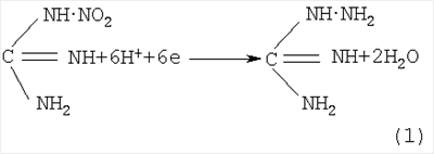 При рН 9÷9,5 в растворе 30% сульфата аммония (каталит) и 20% серной кислоты (аналит) при подачи тока 300 А при температуре (18-21)°С в 2 электрохимической ячейке, где катодом служила амальгамированная медь, наблюдается восстановление нитрогуанидина до аминогуанидина (1) [Т.Duraiswamy Balakrishnan, К.Shrivara Udupa, G.Srinivasan Subramanian, and H. Venkatakrishna Udupa Electrolytic Production of Aminoguanidine Bicarbonate. / Ind. Eng. Chem. Process Des. Develop., Vol.10, No.4, 1971, 495-497].
