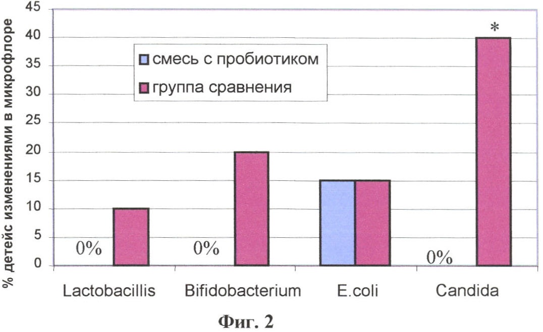 Как видно из диаграммы на фиг.2, в группе детей, получавших смесь с пробиотиком, по основным показателям нормальной микрофлоры (Bifidobacterium, Lactobacillis) желудочно-кишечного тракта в периоде реконвалесценции изменений выявлено не было, а в группе сравнения отмечались изменения у 20% и 10% детей соответственно. Доля детей с изменениями в качественном и количественном составе E.coli в исследуемых группах составила 15% и между группами не отличалась. Достоверные отличия между группами были получены в проценте детей, в анализах кала которых присутствовали грибы рода Candida: у детей, в питании которых присутствовал пробиотик, грибы отсутствовали, в группе сравнения – у 40% детей эти микроорганизмы выявлялись в титрах более 105 КОЕ/мг.