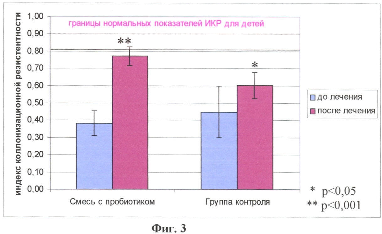 Как видно из диаграммы на фиг.3, было получено достоверное повышение индекса колонизационной резистентности в группе детей, получавших смесь с пробиотиком (p<0,001), после лечения по сравнению с начальным уровнем. В группе сравнения достоверных отличий между показателями индекса колонизационной резистентности до и после лечения получено не было. А при сравнении этого показателя между исследуемыми группами в стадии реконвалесценции были получены достоверные отличия – р<0,05.
