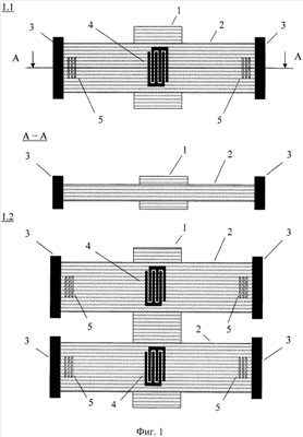 Во всех случаях должно быть сформировано не менее одного ВШП 4 и не менее одной отражающей структуры 5. На фиг.1 показано два варианта реализации гироскопа-акселерометра: 1.1. – один чувствительный к деформациям элемент; 1.2 – два чувствительных к деформациям элемента.