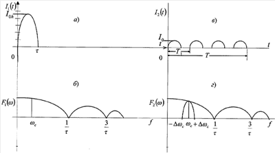 На чертеже изображена временная зависимость формы импульса возбуждения а), в) и его спектра б), г), характерная для прототипа и заявляемого изобретения соответственно, где – длительность импульса 2 возбуждения; T1 – период его повторения в группе НИВ; – центральная частота ожидаемого сигнала; – ожидаемая полоса частот полезного сигнала; Т – общая длительность последовательности импульсов в группе НИВ.