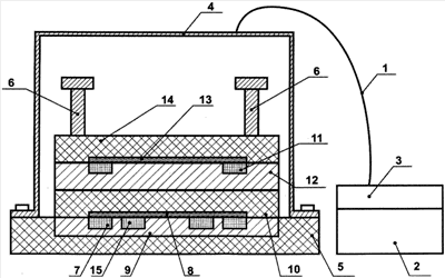 Для частичного гашения паразитной кинетической энергии перемещающихся вверх элементов излучателя используется электродинамический пригруз. Электродинамический пригруз представляет из себя систему из двух электродинамических элементов, имеющих магнитную связь, один из которых представляет из себя плоский соленоид 11, закрепленный в пазу стальной плиты 12, а другой представляет из себя диск из материала с низким значением удельного электрического сопротивления 13, закрепленный на плите из прочного непроводящего материала 14. Элементы электродинамического пригруза располагаются над элементами электродинамического преобразователя энергии с возможностью свободного перемещения в вертикальном направлении на стойках 6.