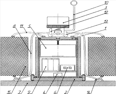 Морская автономная донная станция для выполнения геофизических и геологоразведочных работ доставляется к месту постановки на соответствующем судне, комплектуется заряженными аккумуляторами 9, тестируется, программируется на работу в необходимом режиме, закрывается крышкой-фланцем 2. Непосредственно перед погружением прочный корпус 1 крепится к якорю-грузу 7 спусковыми стропами 8, протягивающимися через специальные крепления-уши 14 на якоре-грузе 7 и крепящимися с одной стороны к креплениям спусковых строп на размыкателе 13, с другой – к плавучести 15. В точке постановки станция погружается на дно, обеспечивая максимально возможный контакт с морским дном благодаря своей конструкции. В соответствии с внутренним расписанием-графиком работы начинается сбор информации с датчиков измерения сейсмического поля 4 и датчиков измерения гидроакустического поля 12, обработка этой информации и ее хранение в электронном блоке регистрации, обработки и хранения сигналов 5. После окончания запланированных работ по внутреннему таймеру или по команде с бортовой гидроакустической антенны электронный блок управления акустической антенной, размыкателем, радиомаяком и проблесковым светодиодным маяком 6 дает команду на всплытие. Размыкатель 13 сбрасывает спусковые стропы 8 и освобождает станцию от якоря-груза 7, плавучесть 15 вместе с прочным корпусом 1 поднимается на поверхность. После обнаружения автономной донной станции, используя гидроакустический канал или средства поиска станции 10, производится подъем станции на борт.