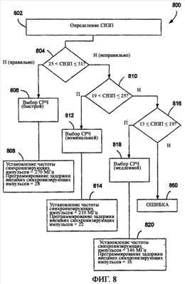 Если результат этапа 810 был “неправильно”, процесс переходит к этапу 816. На этом этапе, если СВЗП больше или равно 13 и меньше или равно 19, то электронное устройство представляет собой “медленное” устройство, и процесс продолжается на этапе 818, где выбирается схема распределения частот СРЧ (медленная). Затем на этапе 820 интегральная схема устанавливает системные синхронизирующие импульсы для работы на частоте 146 МГц и задержку внешних синхронизирующих импульсов на 16. Если на этапе 816 результат “неправильно”, то возникает состояние ошибки, представленное на этапе 850. Например, если СВЗП окажется ниже 13, произойдет ошибка. В таком случае алгоритм 700 калибровки и алгоритм 800 накопления в бункере частот следования могут быть запущены повторно.
