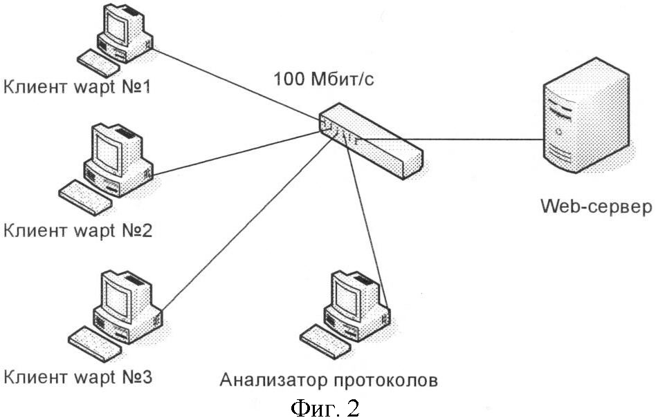 Проводится нагрузочный тест по схеме, представленной на фиг.2. Сегмент сети состоит из web-сервера с тестируемым информационным ресурсом и трех клиентов с установленным на них генератором запросов Wapt. С помощью анализатора протоколов снимаются статистические характеристики показателей качества функционирования сервера t, eERROR.