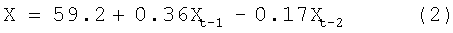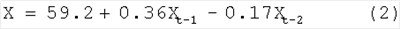 Определение значений выделенных пороговых показателей проводится экспертным путем на основе анализа программно-аппаратных возможностей конкретного сервера и стоящих задач по обеспечению качества обслуживания запросов пользователей. На основе полученной в ходе “нагрузочного теста” статистической выборки времени выполнения запроса строятся модели прогнозирования на основе временных рядов (1), пример модели для частного случая представлен в (2)