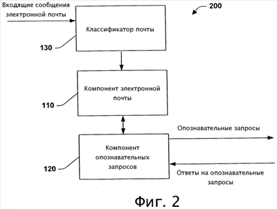 Обратимся к фиг.2, на которой изображена соответствующая одному из аспектов настоящего изобретения система 200, предназначенная для обнаружения незапрашиваемой электронной почты. Система 200 включает в себя компонент 110 электронной почты, компонент 120 опознавательных запросов и классификатор 130 почты. Примерный вариант классификатора 130 почты изложен более подробно в находящейся на рассмотрении одновременно с данной патентной заявкой заявке на патент США на “A TECHNIQUE WHICH UTILIZES A PROBABILISTIC CLASSIFIER TO DETECT “JUNK” E-MAIL”, которая имеет номер 09/102837 и полностью включена в данный документ в качестве ссылки. В одном из примеров классификатор 130 почты получает сообщение электронной почты, определяет ассоциированную вероятность того, что данное сообщение электронной почты является спамом, и сохраняет сообщения электронной почты и ассоциированные вероятности в компоненте 110 электронной почты. Классификатор 130 почты анализирует содержание сообщения для заданного получателя, на основе данного содержания для данного пользователя проводит различие между спамом и легальными сообщениями (не являющимися спамом) и таким образом классифицирует каждое входящее сообщение электронной почты для рассматриваемого получателя.