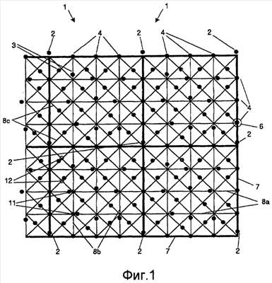 Как показано на Фиг.1, прямоугольная область, такая как квадрат или прямоугольник, с поверхности средства, такого как печатное средство, определяется как блок 1. В добавление наряду с тем, что каждая прямая линия в вертикальном и горизонтальном направлениях, формирующая рамку блока 1, определяется как линия 7 координатной сетки (линии, обозначенные толстыми линиями на Фиг.1), точки 6 виртуальной координатной сетки предоставляются через предварительно определенные промежутки на линии 7 координатной сетки, и точечные элементы 4 точки координатной сетки размещаются на точках 6 виртуальной координатной сетки. Следующее, прямые линии, соединяющие точки 6 виртуальной координатной сетки друг с другом и расположенные параллельно линии 7 координатной сетки, определяются как линии 8а, 8b сетки, и точка пересечения между линиями 8a и 8b сетки определяется как точка 11 виртуальной сетки (точка первой виртуальной сетки).