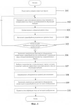На Фиг.1 приведена общая схема способа функционирования системы распознавания лиц, предлагаемой в данном изобретении. На первом этапе выполняют подготовку галереи известных персон. Данная галерея содержит лица людей, которые должны быть известны системе. Каждое изображение человека из галереи преобразуют в специальное представление, соответствующее методам распознавания, реализованным в системе. Такими представлениями могут быть, например, вектор главных компонент, построенных по изображению лица, граф, в вершинах которого находятся особенные точки лица (уголки глаз и рта, крылья и кончик носа и т.п.). К выбранному представлению затем преобразовывают каждое входное изображение перед проведением классификации.
