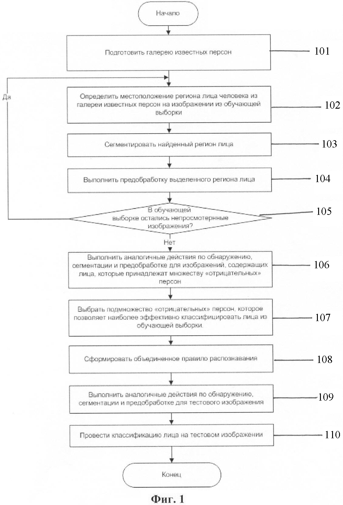 7. Система для реализации заявляемого способа распознавания лиц, включающая в себя: блок хранения галереи изображений «отрицательных» лиц, т.е. тех людей, которые никогда не будут подвергаться проверке с помощью заявляемого способа; блок преобразования галереи известных персон, преобразующий изображения лица во внутреннее представление, принятое для алгоритмов распознавания, реализованных в системе; блок детектирования лица человека на входном изображении; блок подготовки сегментированного региона, содержащего лицо, к проведению распознавания путем нормализации положения лица в соответствии с позицией глаз, масштабирование к заданным размерам, нормализация интенсивности; блок реализации базовых алгоритмов распознавания лиц, выполненный с возможностью вычисления меры схожести двух изображений; блок выбора подмножества «отрицательных» лиц, на основе которого автоматически формируется новый алгоритм распознавания; блок конструирования нового алгоритма распознавания на основе преобразования мер близости базового алгоритма с учетом выбранной галереи «отрицательных» лиц; блок распознавания, выполненный с возможностью сравнения входного изображения с заданным или проведения классификации по множеству зарегистрированных изображений, путем применения алгоритма классификации.