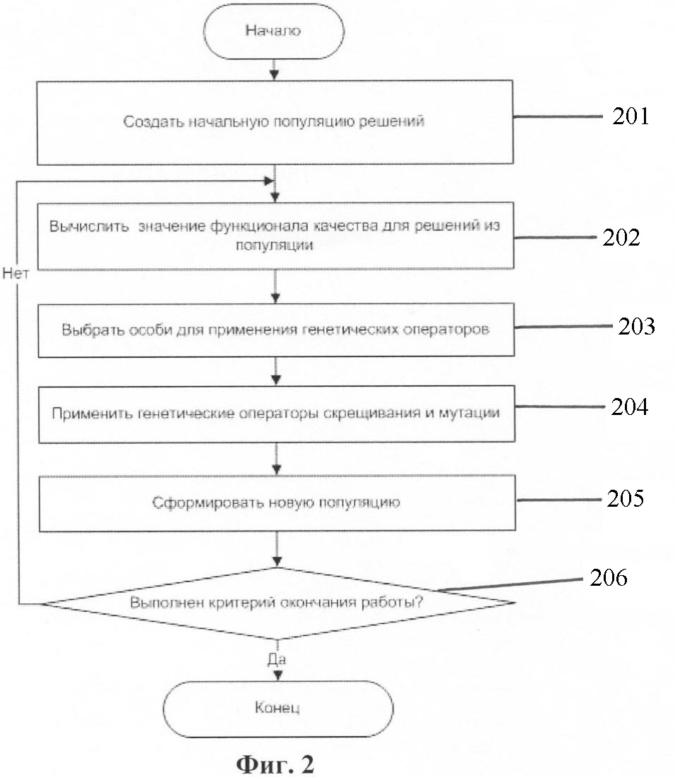На Фиг.2 приведена схема функционирования ГА для решения поставленной задачи оптимизации. Известно, что для создания ГА необходимо определить следующие его элементы: