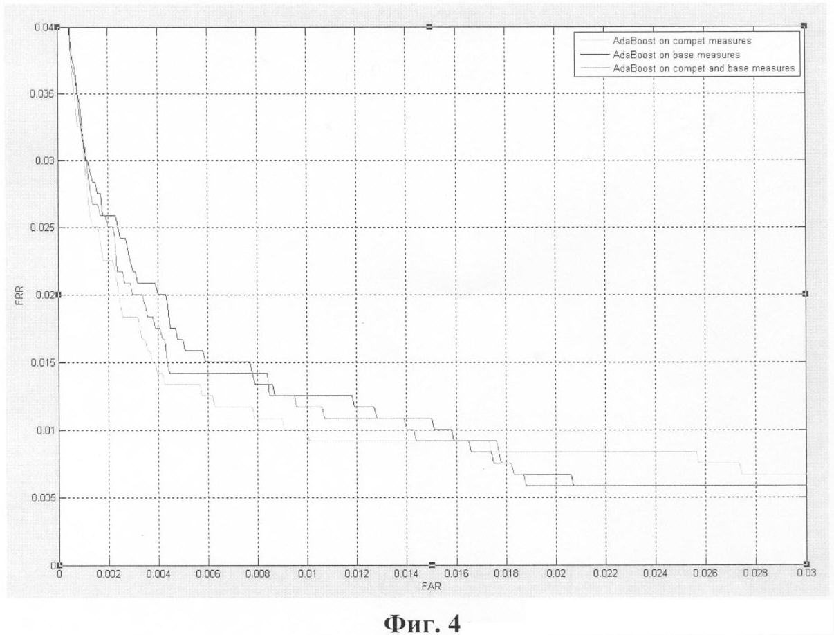 Фиг.4 представляет сравнительные результаты тестирования в режиме верификации объединенных мер близости.