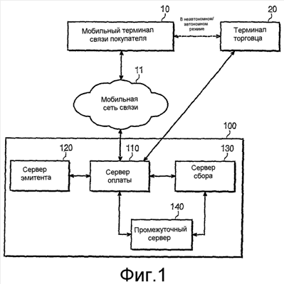 Сервер 220 эмитента выдает, управляет и оперирует платежными средствами. Если мобильный терминал 10 связи покупателя получает доступ к серверу 220 эмитента, сервер 220 эмитента запрашивает мобильный терминал 10 связи покупателя ввести и передать информацию аутентификации оплаты о платежных средствах покупателя и аутентифицирует соответствующую операцию, используя информацию аутентификации оплаты, принятую от мобильного терминала 10 связи покупателя.