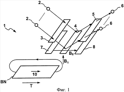 Как описано выше, датчик 6 анализирует колебания интенсивности света, вызываемые поворотом направления поляризации, что позволяет получить отображение магнитных свойств объекта BN. Для этого и детектор 4, и датчик 6 имеют строчную структуру, причем длина детектора 4 и датчика 6 соответствует по меньшей мере одному измерению объекта BN, что позволяет исследовать объект полностью. Как детектор 4, так и датчик 6 могут состоять из отдельных элементов, расположенных строками, но могут также состоять из единственного элемента, например датчик 6 может состоять их одной строки ПЗС-элементов. Сказанное относится и к источнику 2 света, поляризатору 3, анализатору 5 и магнитному устройству 7, 8, т.е. и они могут состоять из расположенных в виде строк отдельных элементов или из отдельных элементов соответствующих размеров.