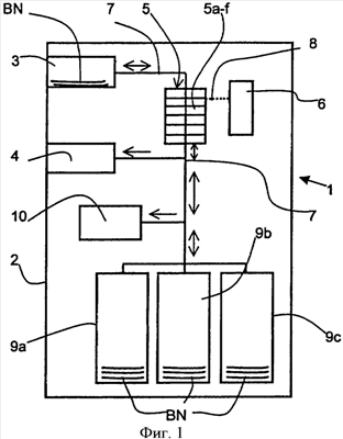 При совершении платежной операции с выплатой денежных средств выдаваемые банкноты BN, находящиеся в кассетах 9а-9с, поштучно отделяются от стопки и транспортируются транспортировочной системой 7 в приемный узел или лоток 4. На фиг.1 показаны обозначенные стрелками возможные пути транспортировки банкнот BN.